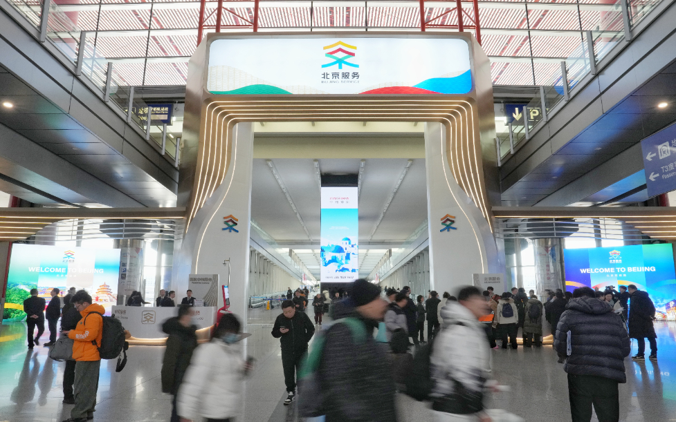 圖為(wei) 2025年1月8日,在北京首都國際機場T3航站樓拍攝的“北京服務”機場服務點。從(cong) 1月1日起,北京在首都國際機場和大興(xing) 國際機場的國際到達出口設立“北京服務”機場服務點,為(wei) 來華、來京外籍人士提供金融、通訊、交通、文旅等四個(ge) 主題的20餘(yu) 項高頻服務,便利八方來客暢遊中國。新華社發 (鞠煥宗攝)