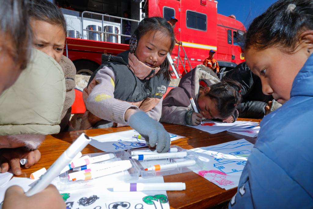 1月11日,在定日縣曲洛鄉(xiang) 措昂村臨(lin) 時安置帳篷間的空地上,孩子們(men) 在畫畫。(新華社記者 沈伯韓 攝)