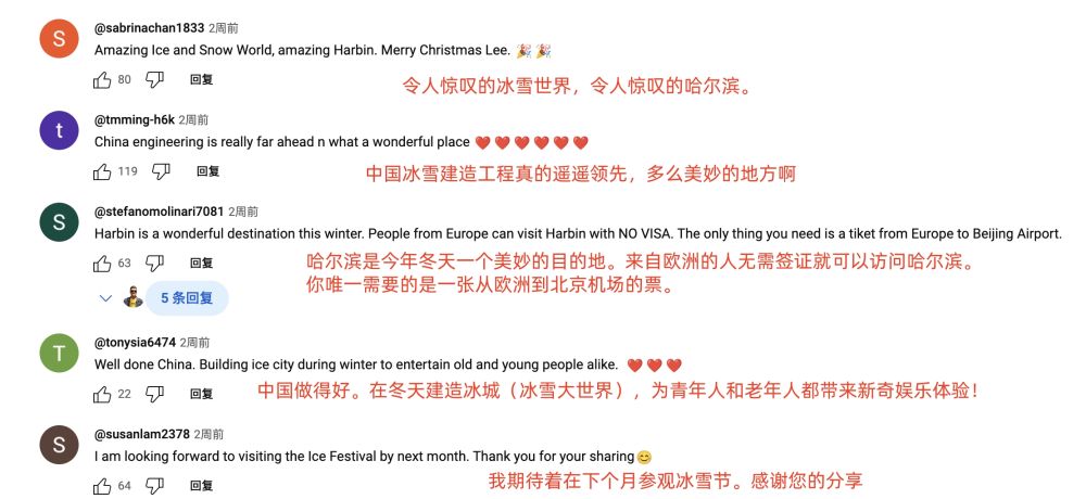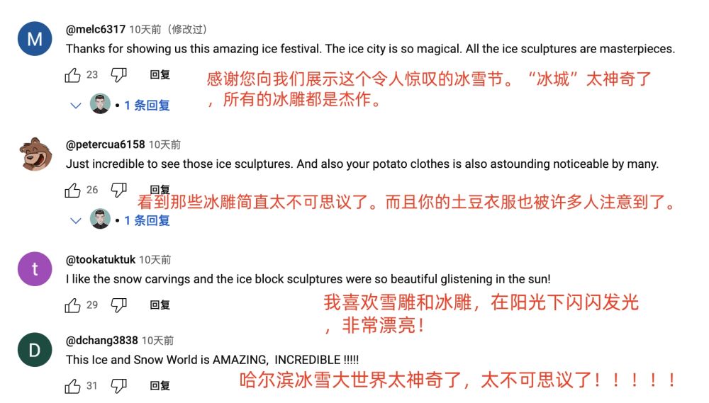 眾(zhong) 多海外博主仿佛找到了“流量密碼”,那就是發布來哈爾濱旅行Vlog,上傳(chuan) 和冰雕的打卡美照,評論區互動好評如潮。