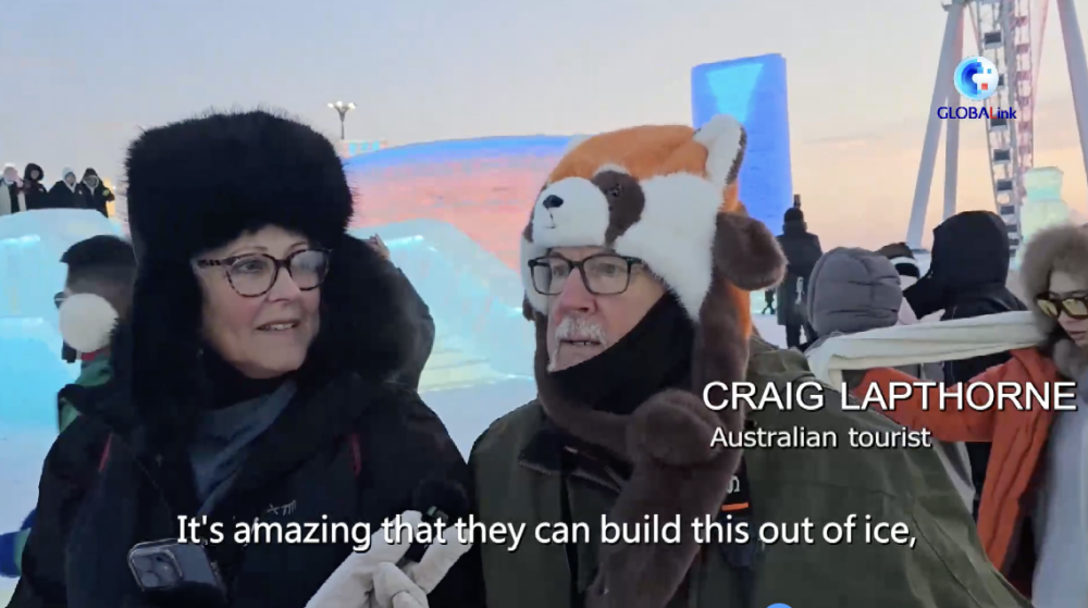 一旁的克雷格·拉普索恩頭戴俏皮卡通棉帽,同樣十分感慨。他驚歎於(yu) 能工巧匠們(men) 用冰雪構築如此繁多的美麗(li) 景觀,不可思議之感溢於(yu) 言表。他還留意到哈爾濱冰雪大世界為(wei) 成人與(yu) 兒(er) 童精心配備冰上自行車等娛樂(le) 設施,深感此地適宜全家出遊,讓每一位家庭成員都能投身冰雪運動,暢享冰雪王國的歡樂(le) 氛圍。