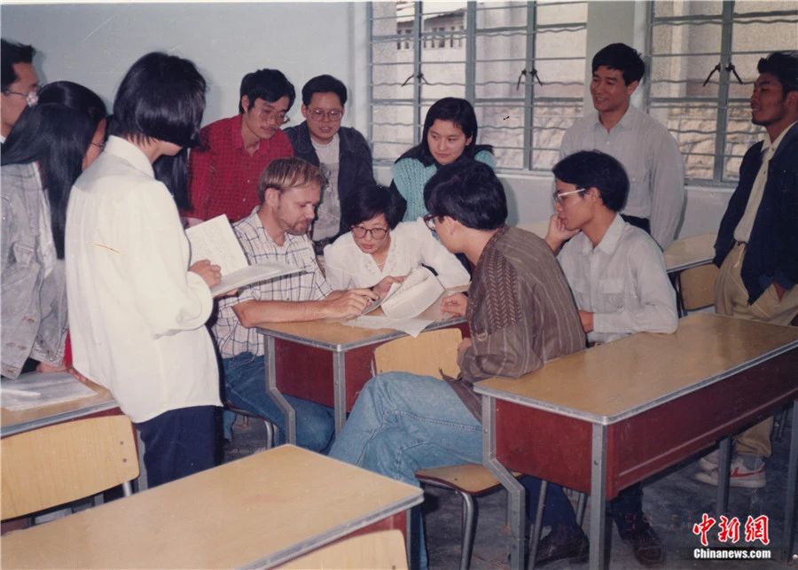 20世紀80年代末,潘維廉在廈門大學的課堂上與(yu) 學生交流。受訪者供圖