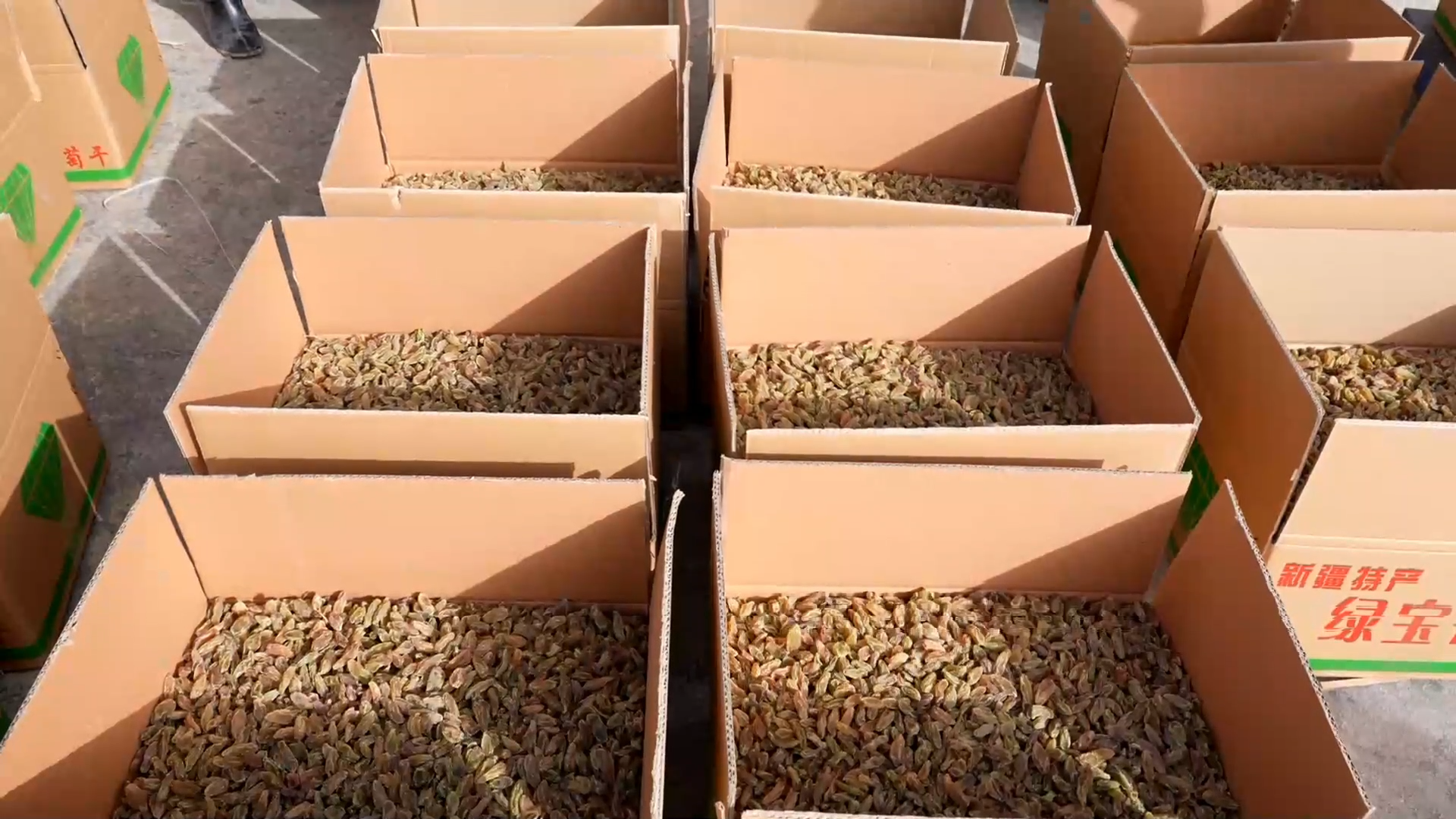 晾曬加工好的葡萄幹打包裝箱 (吾哈力妮薩·努爾麥麥提 攝)