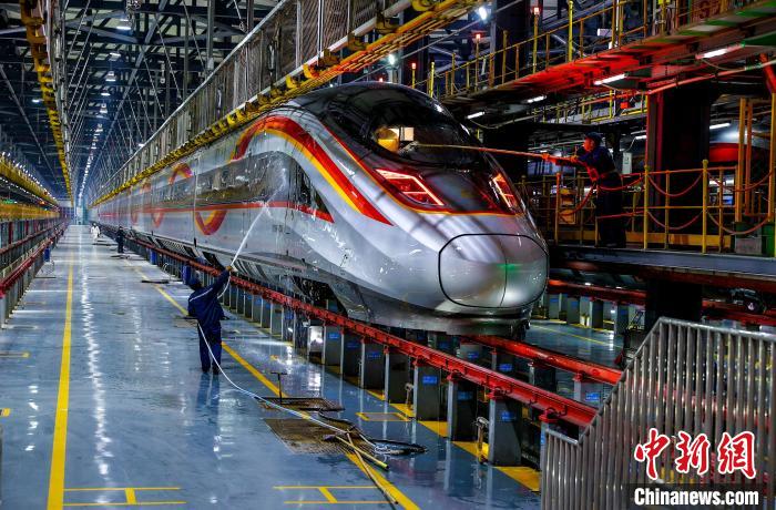 圖為(wei) 修理庫中,工作人員清洗動車。 張暢 攝