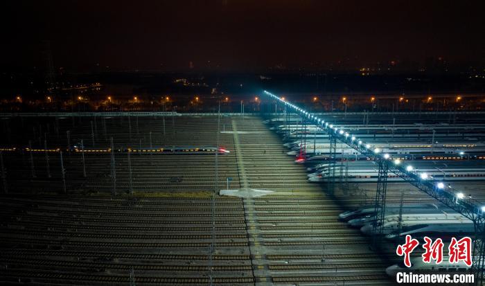 14日淩晨3時,在武漢動車段存車線上,百餘(yu) 組動車整齊排列,勢如“陸地航母”,即將啟航迎接回家的人們(men) 。