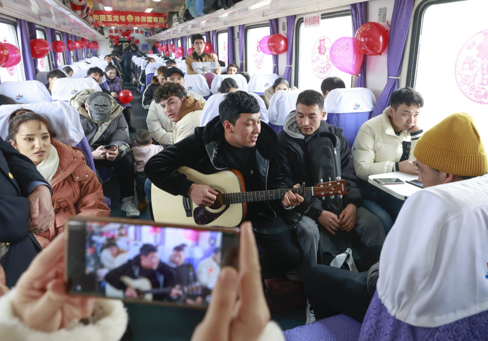 悠揚的琴聲引起其他旅客的注意。得知還有人擅長彈琴,米爾阿迪力熱情地遞上自己的吉他,好幾個(ge) 手癢的旅客輪番獻藝,聽到柔情的民謠,不少人跟著哼唱起來。午後的陽光透進車窗,窗戶上的“福”字映在旅客們(men) 的臉上。