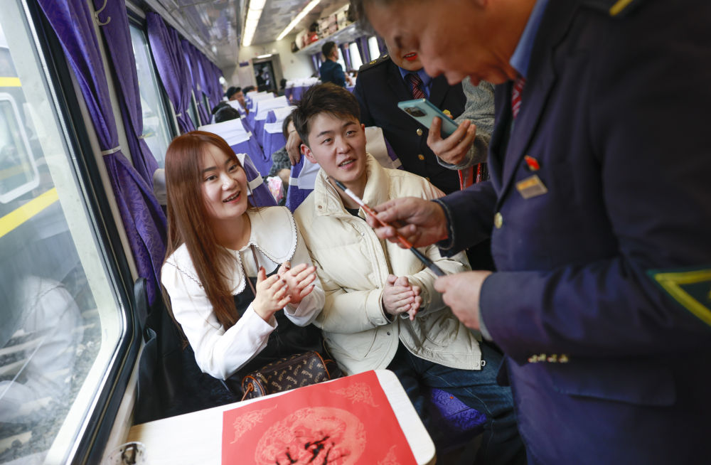 為(wei) 了讓人們(men) “滿載而歸”,列車員熱情組織旅客寫(xie) “福”字,還送上飽含心意的春聯、列車紀念徽章等禮物。