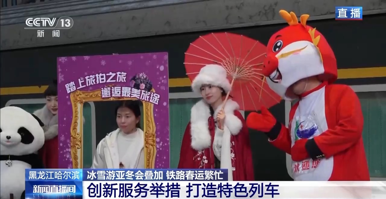在春運期間,鐵路部門還打造了特色主題列車,比如現在已經開通的“旅拍列車”。車上設置了哈爾濱街景、民俗文化、冰雪奇遇等主題場景,車上還有化妝間、更衣室,可以為(wei) 旅客提供多種風格的旅拍服飾,旅客可以通過手機小程序進行預約。拍攝人員也是由愛好攝影的鐵路職工組成的旅拍團隊,大家都是利用業(ye) 餘(yu) 時間為(wei) 旅客免費提供服務。