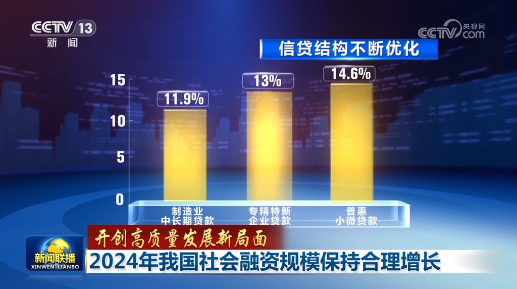 中國人民銀行相關(guan) 負責人介紹,2024年12月末,社會(hui) 融資規模存量為(wei) 408.34萬(wan) 億(yi) 元,其中,對實體(ti) 經濟發放的人民幣貸款餘(yu) 額為(wei) 252.53萬(wan) 億(yi) 元,同比增長7.2%。信貸結構不斷優(you) 化,製造業(ye) 中長期貸款、專(zhuan) 精特新企業(ye) 貸款、普惠小微貸款增長較快,繼續高於(yu) 同期全部貸款增速。