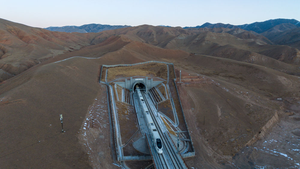 1月14日8時20分許,蘭(lan) 州西發往武威東(dong) 的D8885次動車組列車穿過新烏(wu) 鞘嶺隧道。這是新烏(wu) 鞘嶺隧道通車後迎來的首列春運列車(無人機照片)。新華社記者 郎兵兵 攝