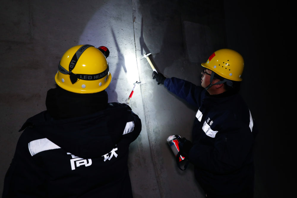 1月14日淩晨,在新烏(wu) 鞘嶺隧道內(nei) ,橋隧工使用小錘檢查邊牆和施工縫。新華社記者 郎兵兵 攝