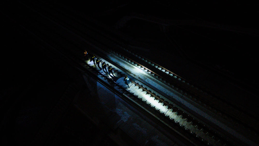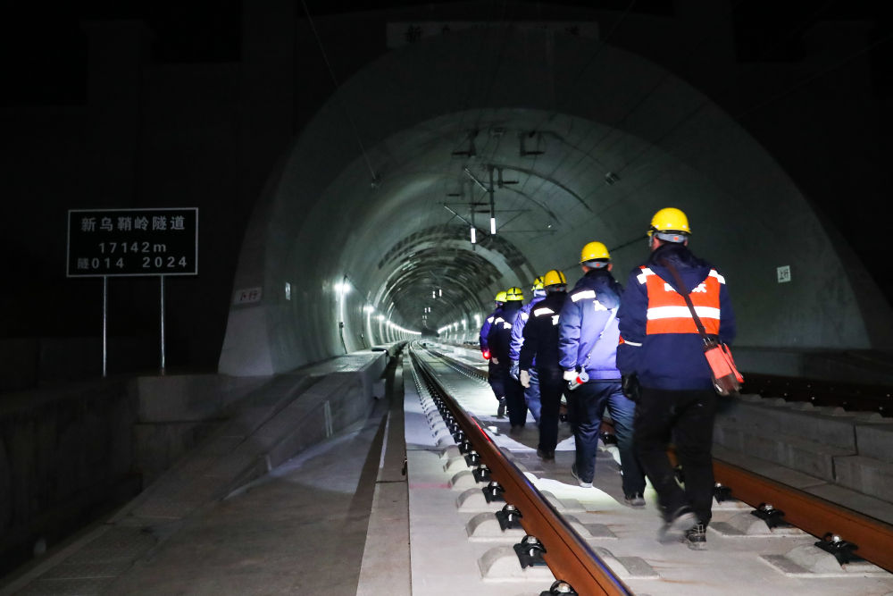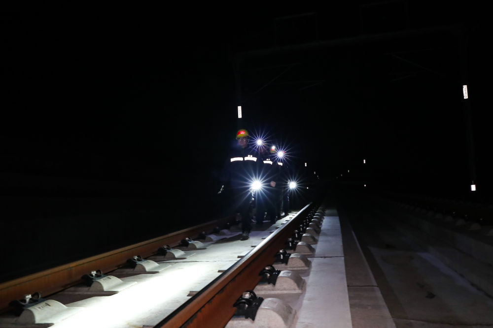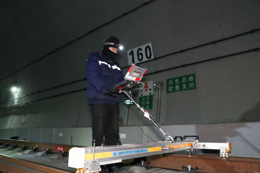 1月14日淩晨,在新烏(wu) 鞘嶺隧道內(nei) ,線路工使用鐵路軌道檢查儀(yi) 檢查線路幾何尺寸。新華社記者 郎兵兵 攝