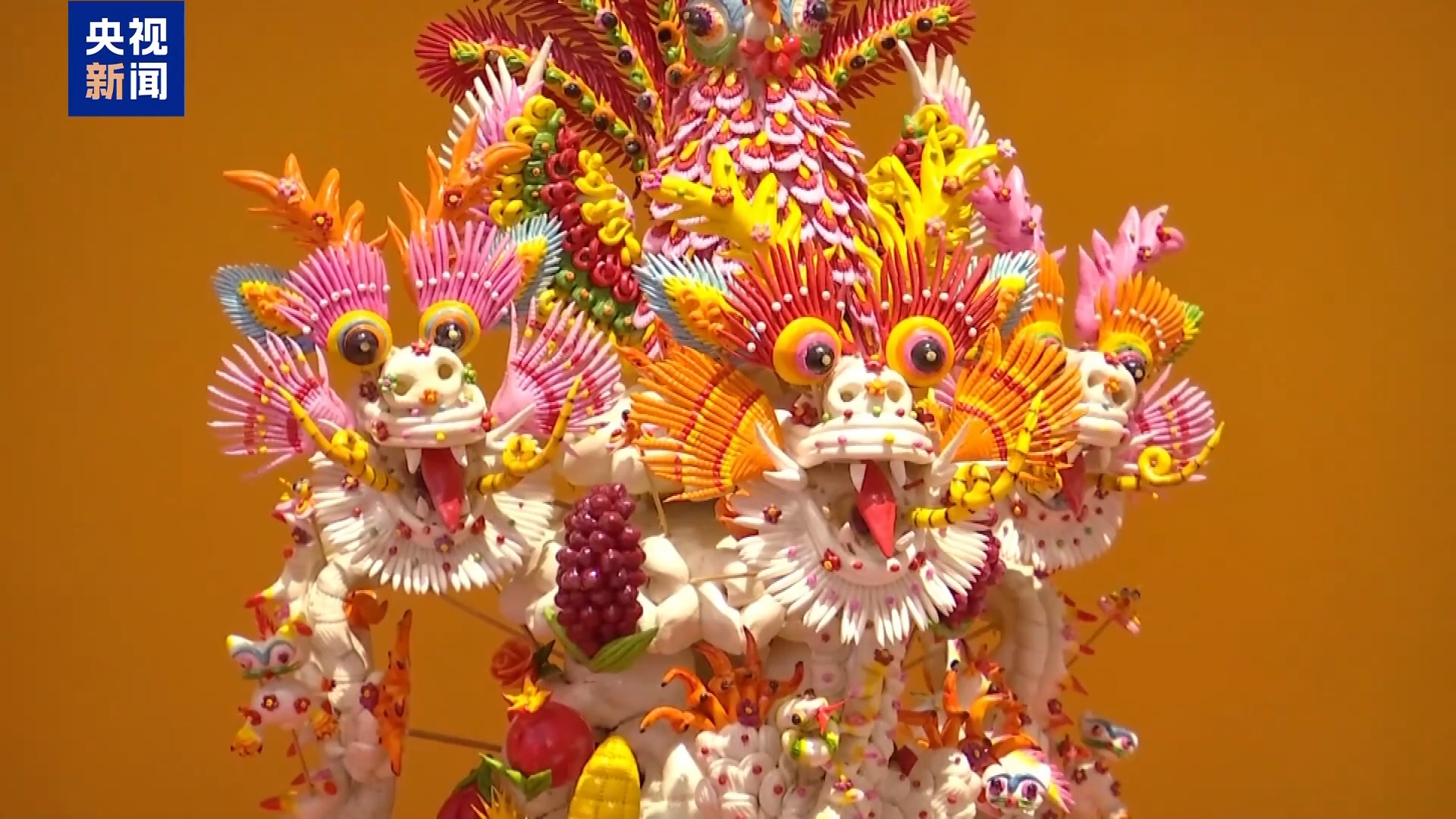 由地方非遺傳(chuan) 承人製作,傳(chuan) 統與(yu) 創新兼具的麵花作品《龍鳳棗山》,用搓、揉、編等10多道工序結合製作而成,吸引了不少觀眾(zhong) 駐足觀看。