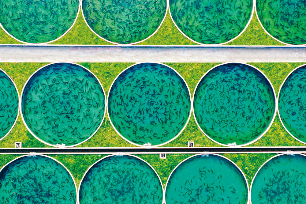 在四川省天全水產(chan) 現代農(nong) 業(ye) 園內(nei) ,上百個(ge) 圓形流水魚池依河而建。圖片由天全縣委宣傳(chuan) 部提供。