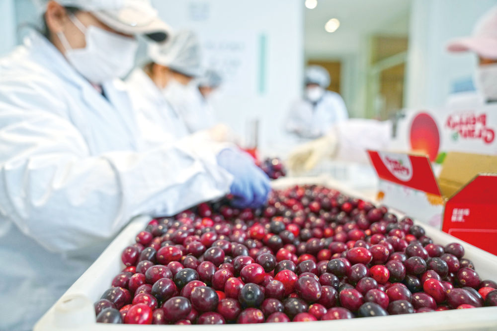 在黑龍江省撫遠市蔓越莓種植基地研發中心,工作人員正在挑選蔓越莓鮮果。新華社記者王建威