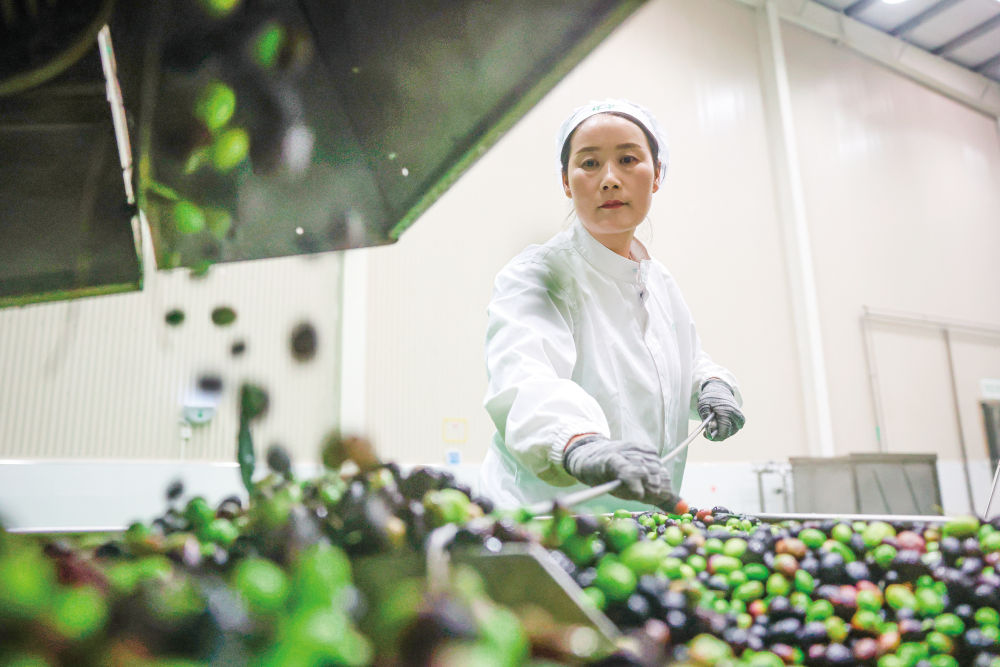 10月31日,在甘肅省隴南市武都區一家油橄欖加工企業(ye) ,工作人員在生產(chan) 線上作業(ye) 。 新華社記者 陳斌 攝