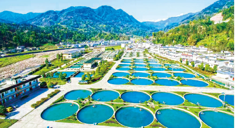 天全水產(chan) 現代農(nong) 業(ye) 園,上百個(ge) 依河而建的圓形流水魚池中,鱘魚正在遊曳。圖片由天全縣委宣傳(chuan) 部提供。