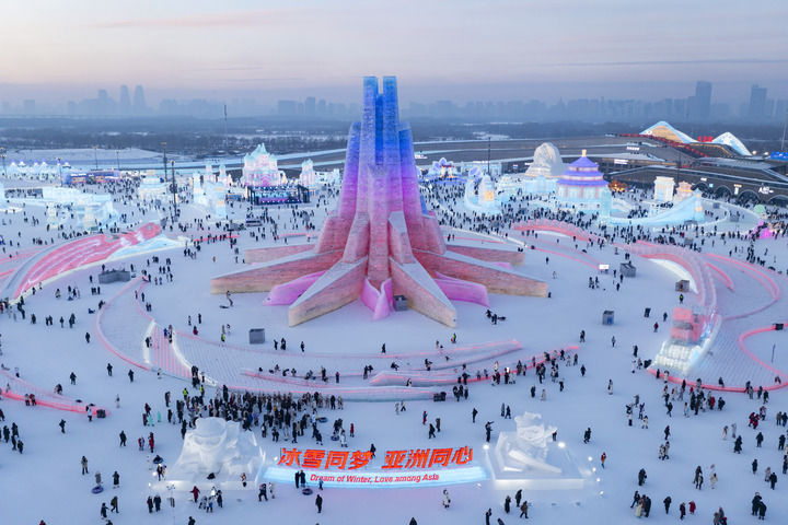 2025年1月5日,在哈爾濱冰雪大世界園區,遊客在主塔“亞(ya) 洲同心”附近遊玩(無人機照片)。新華社記者 謝劍飛 攝