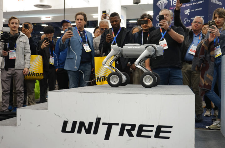 2025年1月8日,在2025年美國拉斯維加斯消費電子展(CES)上,人們(men) 在中國企業(ye) 宇樹科技的展區觀看機器狗展示。新華社發(曾慧攝)