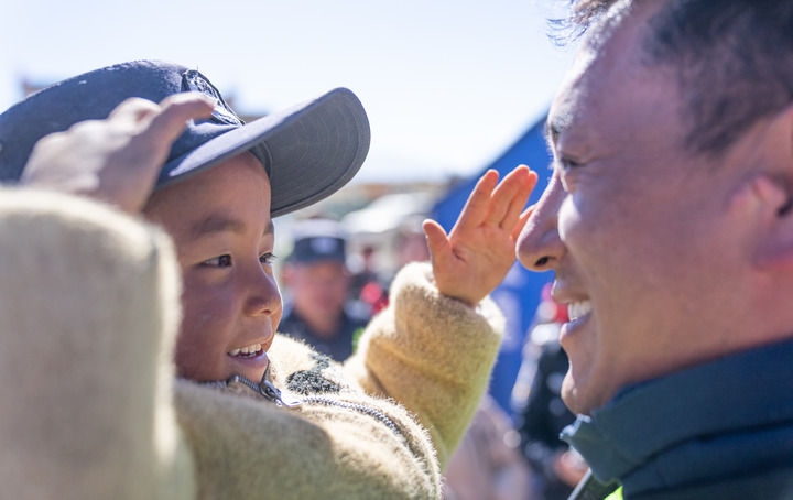 2025年1月14日,在西藏定日縣長所鄉(xiang) 嘎布村,一個(ge) 孩子戴上移民管理警察米瑪次仁的帽子敬禮。新華社記者 丁增尼達 攝