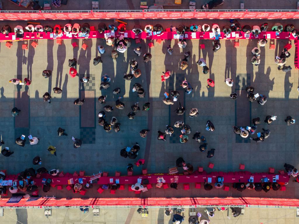 2025年1月15日,求職者在招聘會(hui) 現場了解招聘信息(無人機照片)。新華社發(阮雪楓攝)