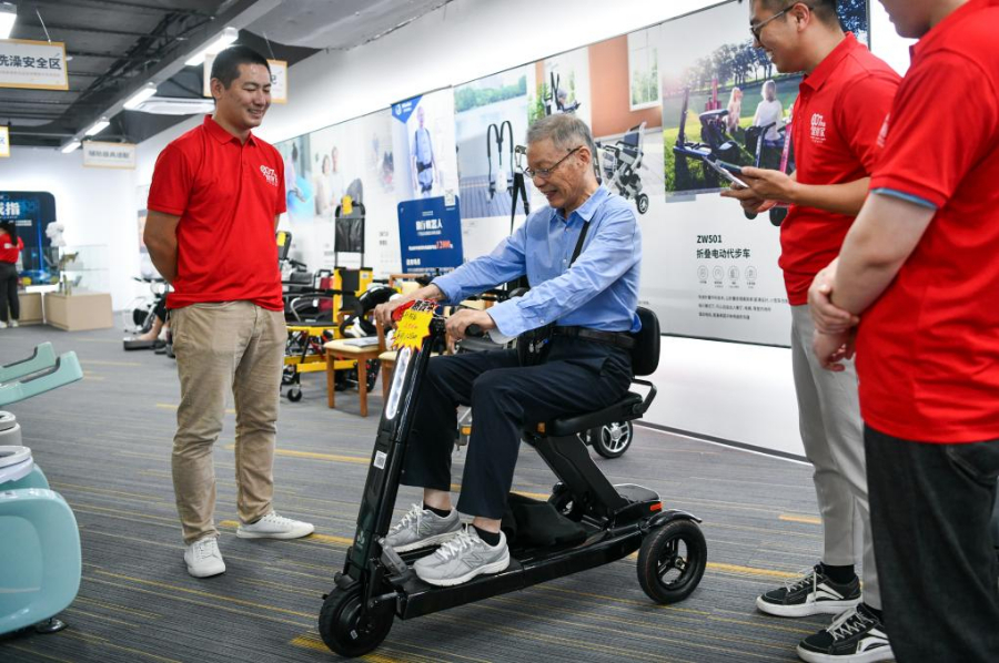 2024年10月12日,一名老人在體(ti) 驗折疊電動代步車。位於(yu) 深圳的老年用品商場“深業(ye) ·健康匯”向市民開放,展示居家安全、娛樂(le) 生活、智能照護等50餘(yu) 個(ge) 品類、數百種智能居家適老產(chan) 品,吸引眾(zhong) 多市民前來了解、選購。新華社記者梁旭 攝