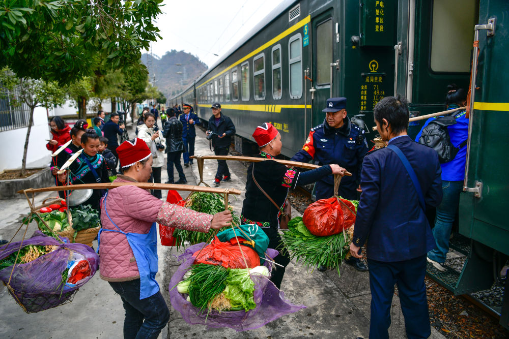 1月18日,在滬昆鐵路六個(ge) 雞火車站,村民準備登上5640次列車售賣蔬菜和年貨。新華社記者 楊文斌 攝