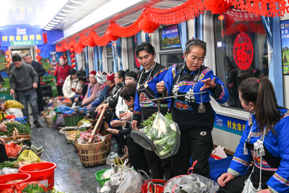 1月18日,在5640次列車上,乘客在“鄉(xiang) 村集市”車廂購買(mai) 蔬菜。新華社發(餘(yu) 天英 攝)