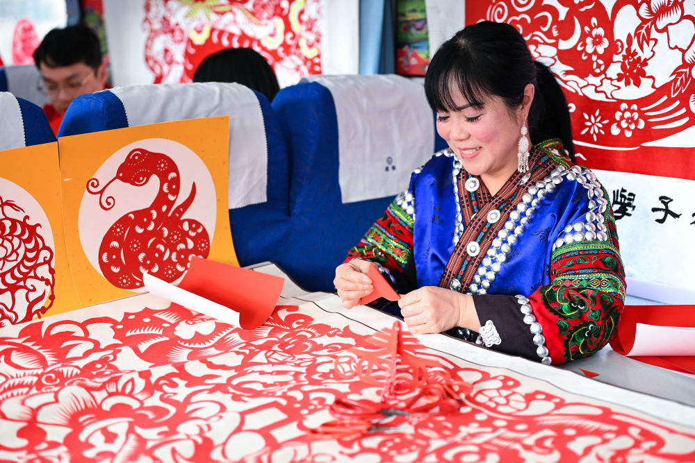 1月18日,非遺傳(chuan) 承人在5640次列車上向乘客展示剪紙技藝。新華社記者 楊文斌 攝