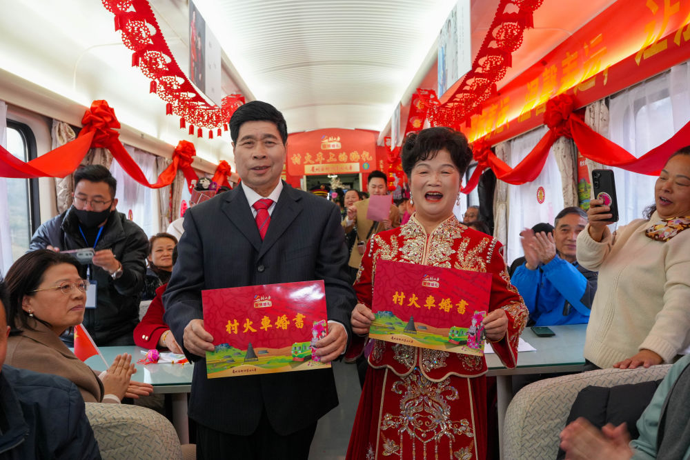 1月18日,一對金婚夫婦在5640次列車上舉(ju) 行“村火車上的婚禮”。新華社發(龍建睿 攝)