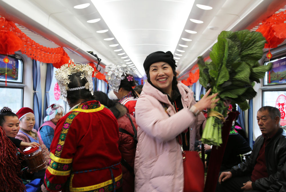 1月18日,沿途村民在5640次列車“鄉(xiang) 村集市”車廂售賣農(nong) 產(chan) 品。新華社記者 楊文斌 攝