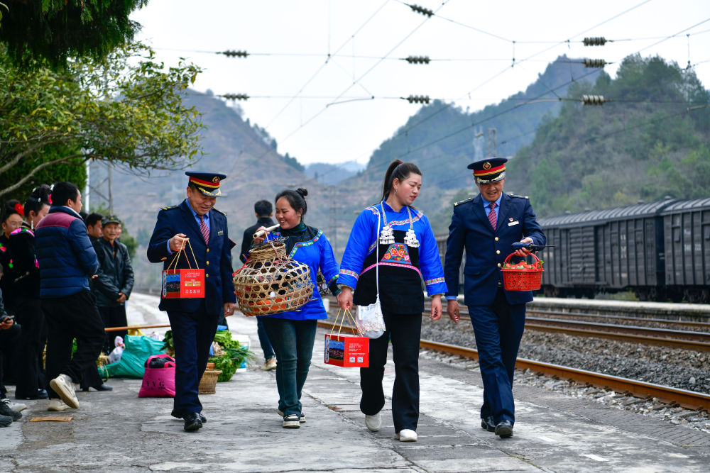 1月18日,在滬昆鐵路六個(ge) 雞火車站,鐵路工作人員與(yu) 村民交流當天售賣的農(nong) 產(chan) 品情況。新華社記者 楊文斌 攝