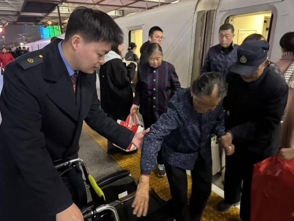 圖為(wei) 1月18日,蘇州站鐵路工作人員為(wei) 進城高齡老人提供暖心到站接車服務。新華社發 馬驍攝