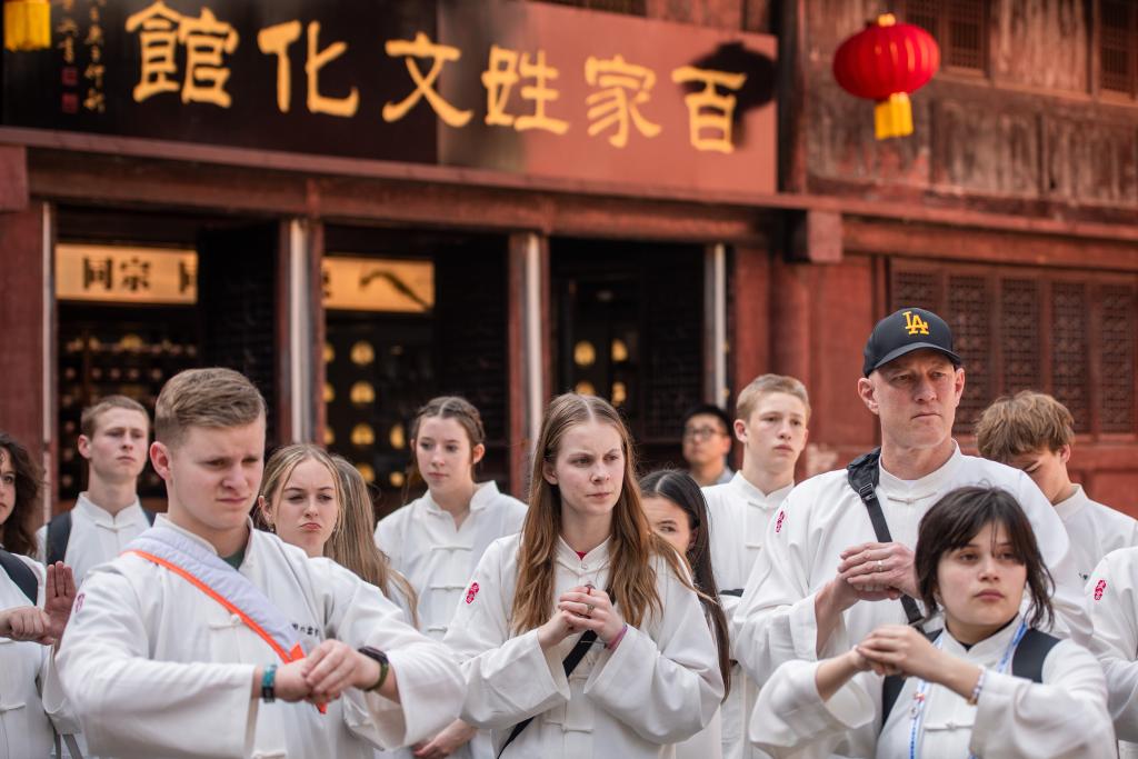 2024年3月22日,美國華盛頓州中學生代表團成員在武當山學習(xi) 如何抱拳。新華社記者 伍誌尊 攝