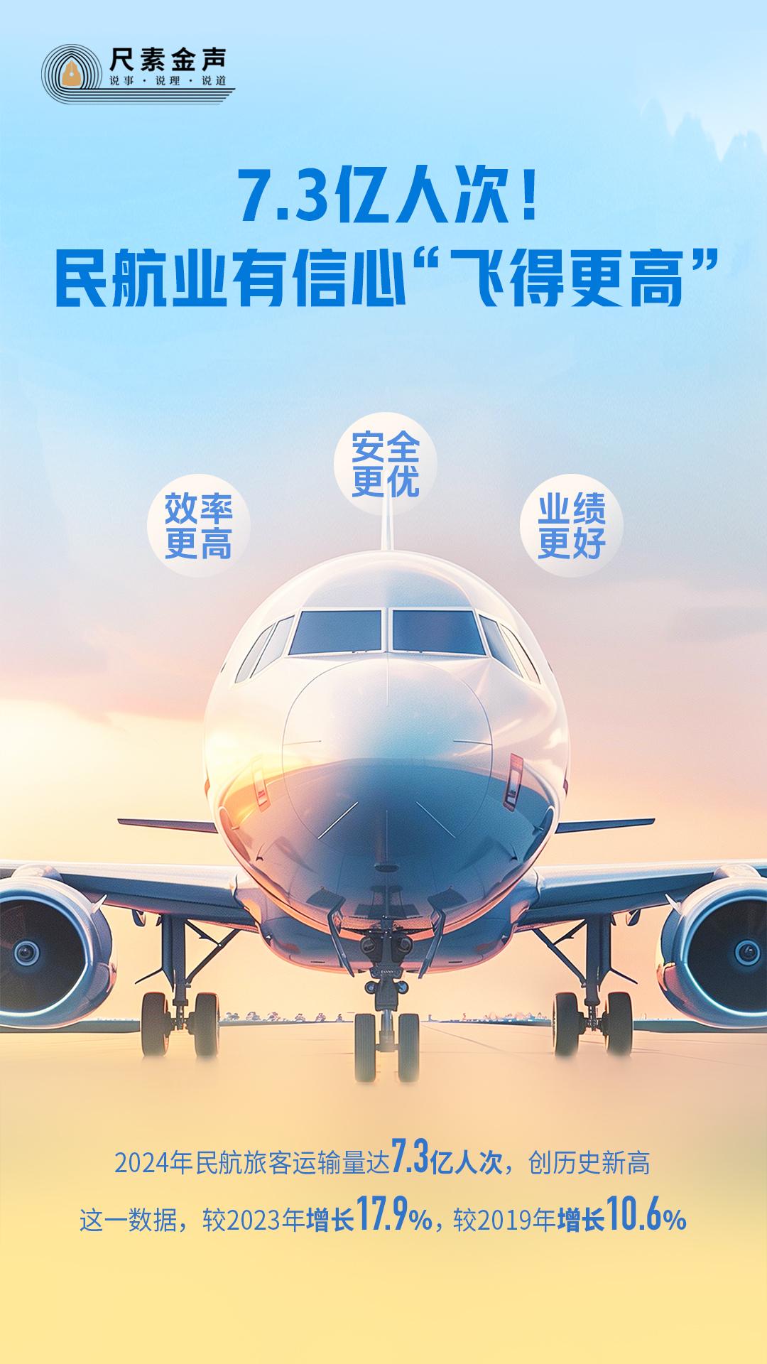 7.3億(yi) 人次! 2024年民航旅客運輸量達7.3億(yi) 人次,創曆史新高,這一數據,較2023年增長17.9%,較2019年增長10.6%。