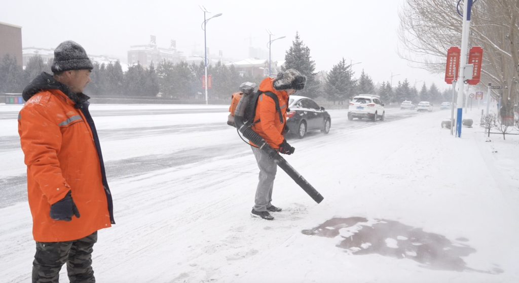 背上清掃機,扣動開關(guan) ,左右搖擺風槍,看著成片的浮雪被吹散,記者似乎找到了“童趣”,然而很快便體(ti) 會(hui) 到了這項工作的不易:十多公斤對記者來說不算重,但它並不像書(shu) 包那般柔軟,堅硬的汽油機轟鳴震動,沒有緩衝(chong) 地拍打著脊背。短短十多分鍾,起初的新鮮感和樂(le) 趣便已消失,隻有噪音為(wei) 伴。