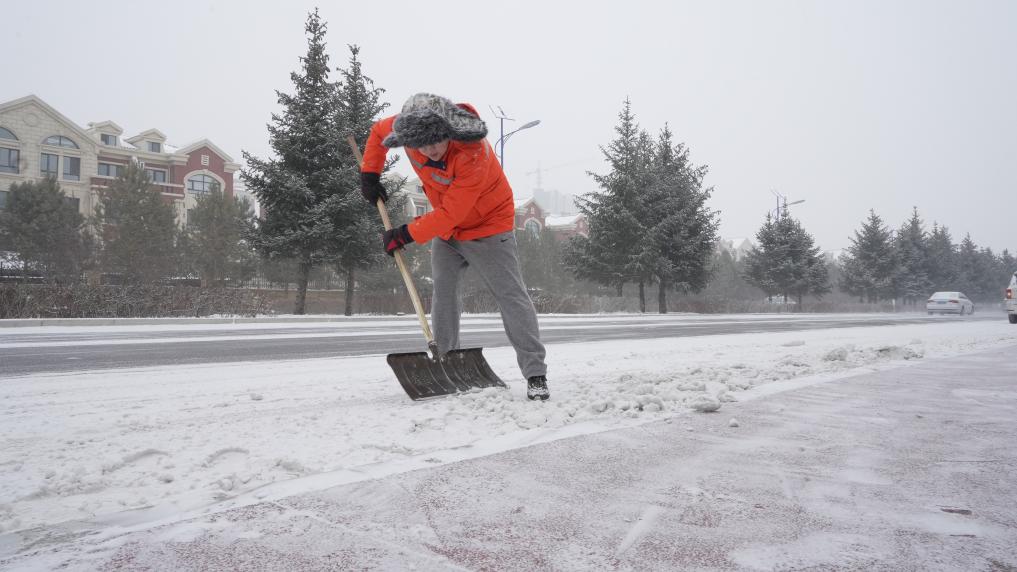 圖為(wei) 新華社記者恩浩在科右前旗罕山街鏟雪。新華社發(路斌攝)