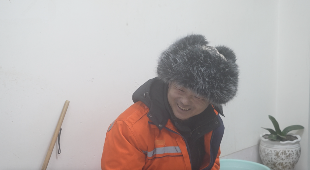 從(cong) 下午1點半到4點,記者和工友們(men) 一刻未停。風雪中,大夥(huo) 都變成了“白眉大俠(xia) ”,睫毛上也結了冰。王師傅提出,去附近的環衛驛站裏歇歇腳,喝些熱茶。