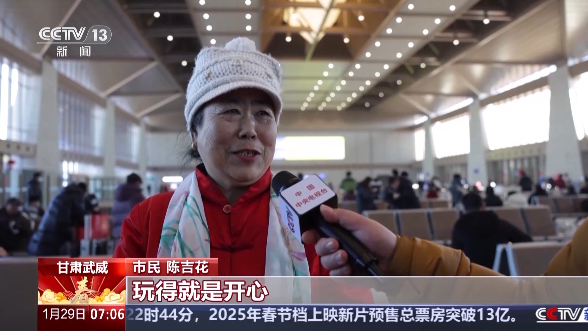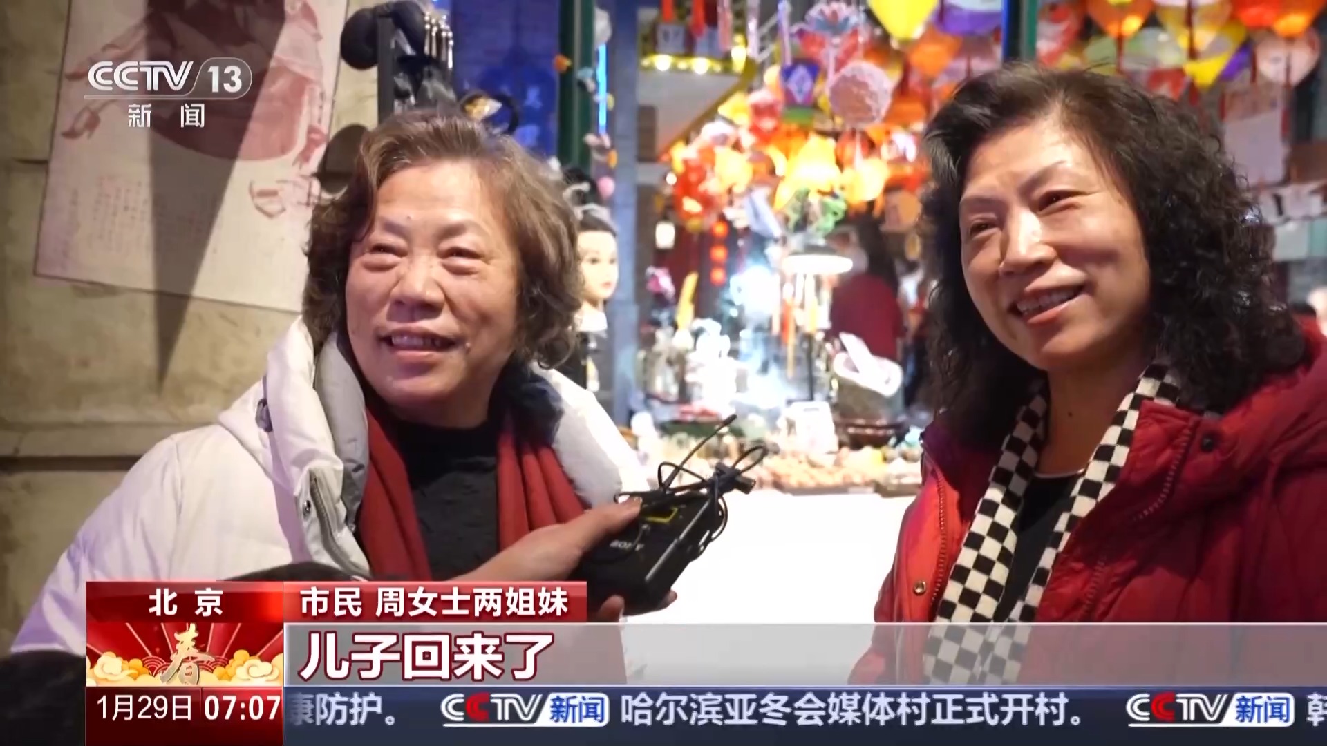 北京市民 周女士兩(liang) 姐妹:跟兒(er) 子一起過。兒(er) 子回來了,跟兒(er) 子一起逛廟會(hui) ,吃北京的小吃,豆汁、麻豆腐、焦圈,這都是北京的最愛。大家一起團團圓圓,談天說地,回憶這一年所走過的路程,展望未來。國家好,是家庭也好,孩子們(men) 都好,老年人生活更好。