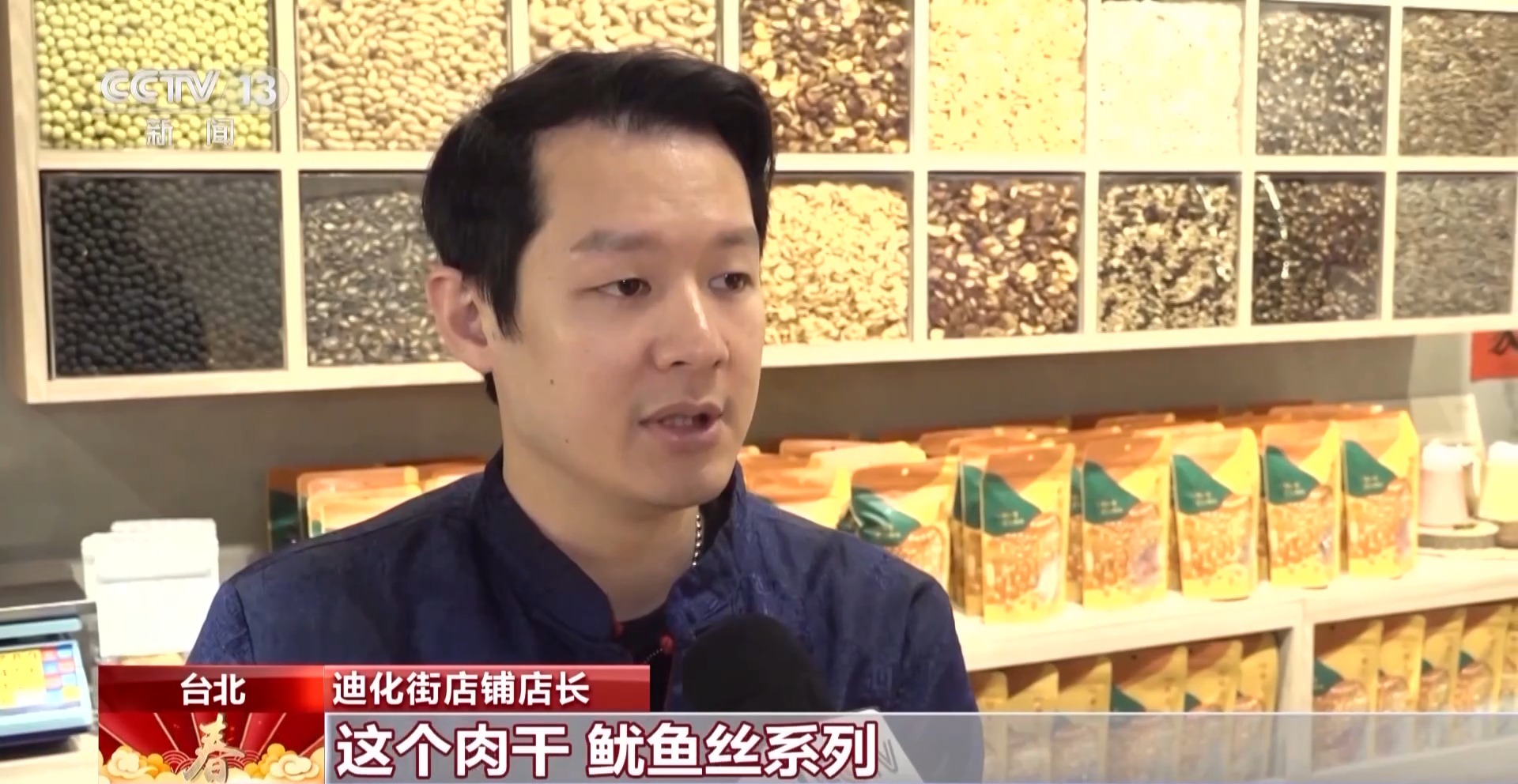 迪化街店鋪店長:春節期間大部分人家會(hui) 選擇這個(ge) 肉幹、魷魚絲(si) 係列,還有我們(men) 擺放漂亮的糖果係列為(wei) 主要的采購商品。