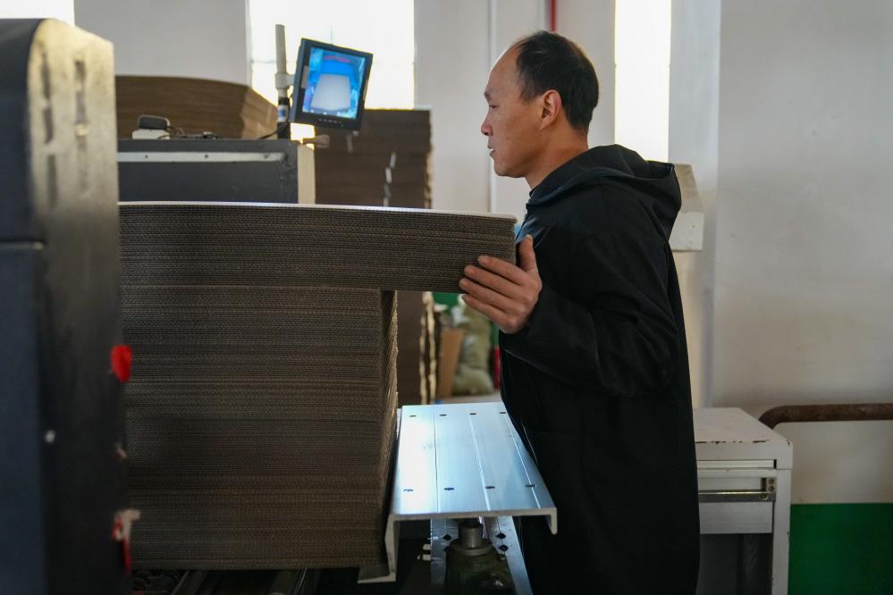 春節前後,位於(yu) 大瑤鎮的瀏陽市凱洋包裝廠裏,印刷、裁剪、折疊、黏合……自動化生產(chan) 線每天下線5萬(wan) 多個(ge) 紙箱。