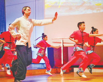 在2025年柏林及勃蘭(lan) 登堡中國留學生蛇年春節聯歡晚會(hui) 上,當地學生表演武術節目《中國武魂》。記者 劉 赫攝