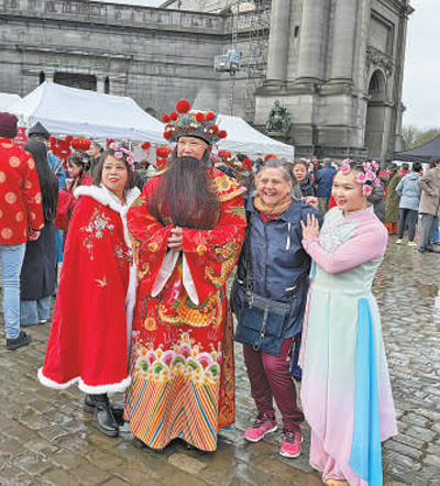 在比利時布魯塞爾舉(ju) 辦的“中國春節遊園廟會(hui) ”上,當地觀眾(zhong) 與(yu) 廟會(hui) 演員合影。記者 牛瑞飛攝