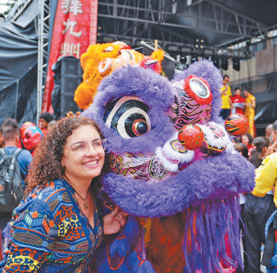 當地時間2月1日,在巴西聖保羅市中心自由廣場舉(ju) 辦的歡樂(le) 春節園遊會(hui) 開幕式上,當地民眾(zhong) 與(yu) 舞獅表演者合影。記者 時元皓攝