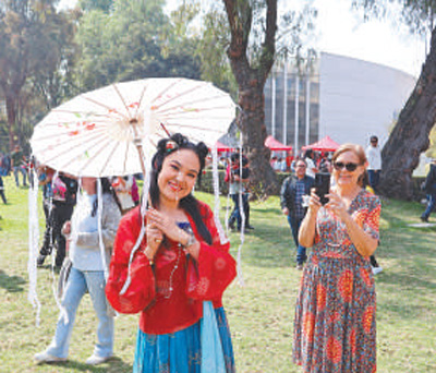 在墨西哥第四屆中國新年文化節上,當地青年身著中國傳(chuan) 統服飾留影紀念。本報墨西哥分社 埃內(nei) 斯托·多明戈斯攝