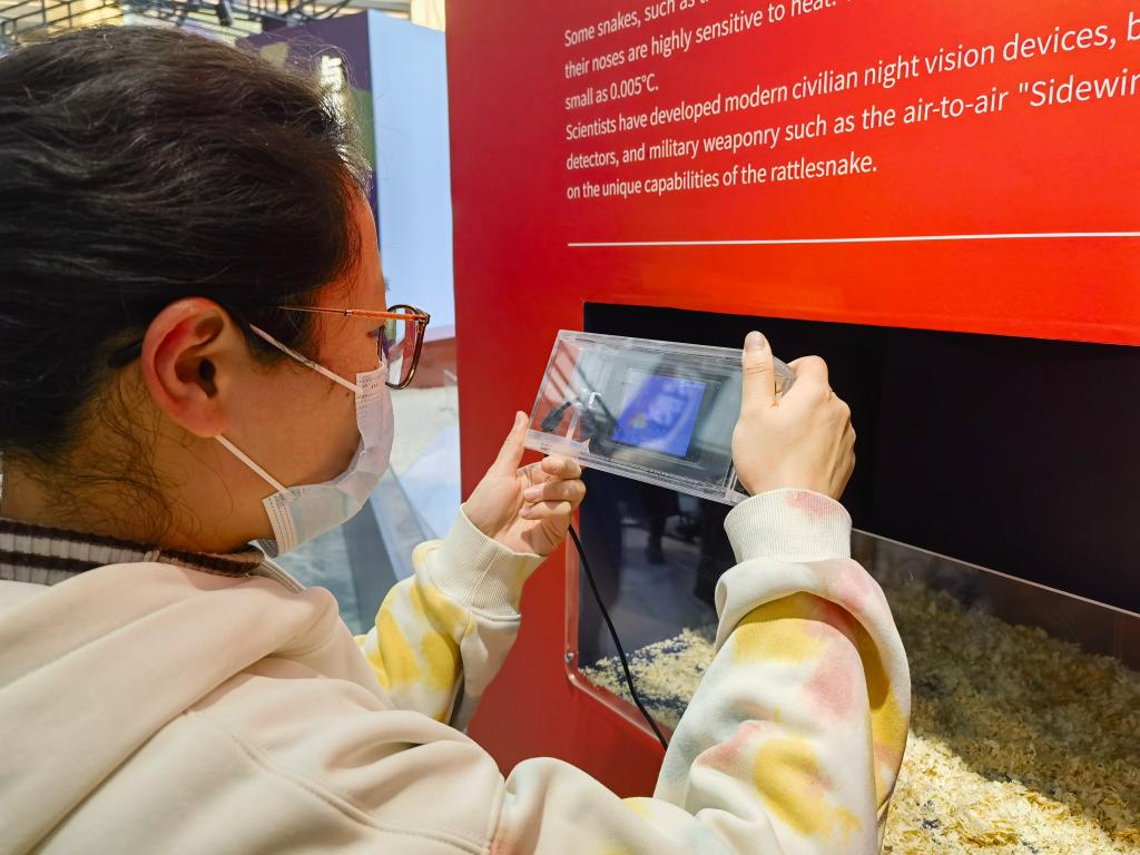遊客在上海自然博物館裏通過紅外互動裝置了解蛇如何“鎖定”獵物。新華社記者 陳愛平 攝