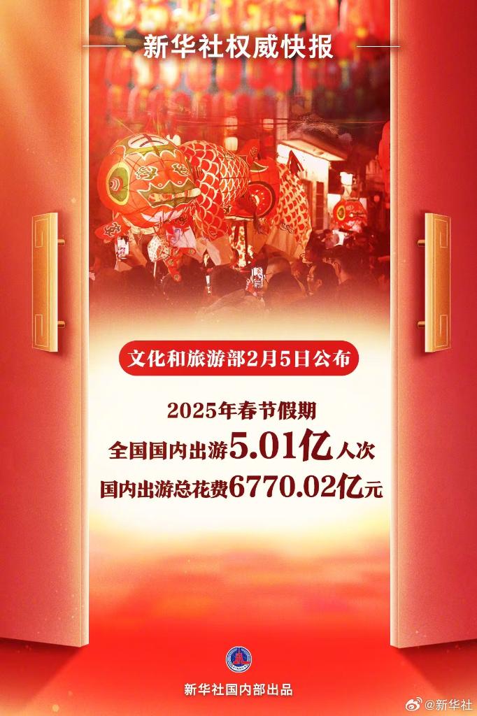 2月5日,文化和旅遊部公布春節假期最新數據:春節假期8天,全國國內(nei) 出遊5.01億(yi) 人次,同比增長5.9%;國內(nei) 出遊總花費6770.02億(yi) 元,同比增長7.0%。全國出遊人次和總花費再創新高!