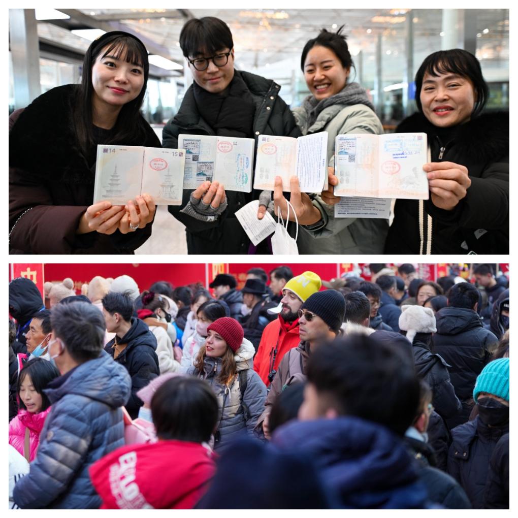 拚圖:(上圖)1月28日,在首都國際機場,四名韓國遊客利用免簽政策來中國旅遊,他們(men) 向記者展示著護照上的入境章。(下圖)1月29日,兩(liang) 位來自西班牙的遊客在北京地壇廟會(hui) 遊覽。