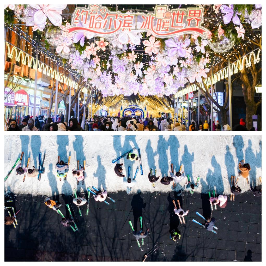 拚圖:(上圖)1月30日,遊客在哈爾濱中央大街上遊玩、拍照。(下圖)2月3日,遊客在江蘇省淮安市馬頭鎮的古運河滑雪場滑雪(無人機照片)。