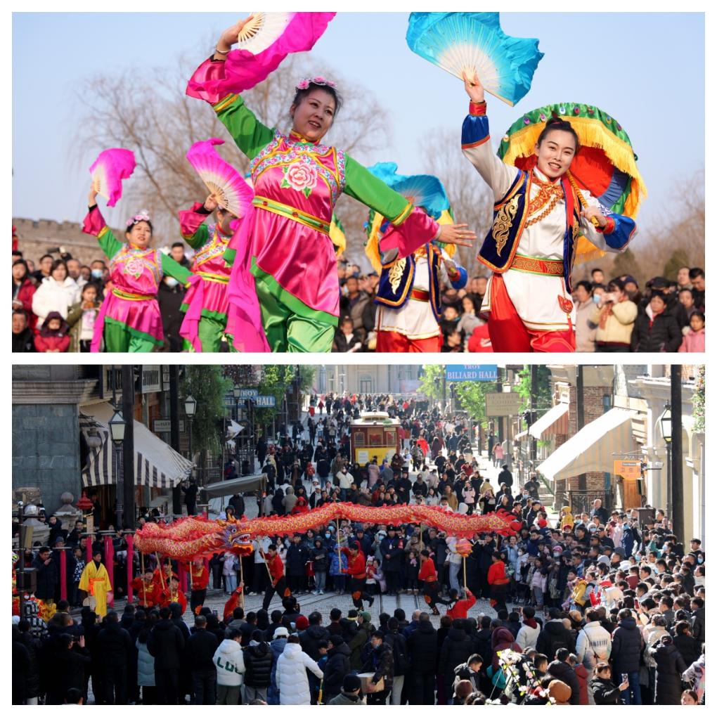 拚圖:(上圖)2月2日,在河北省石家莊市井陘縣天長宋古城,民俗藝人為(wei) 遊客表演井陘拉花。(下圖)2月3日,遊客在山東(dong) 省樂(le) 陵市影視城觀看舞龍表演。