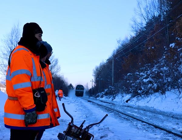 2月2日,小興(xing) 安嶺,綏化工務段伊春二工隊班長田立鋒帶領6名青工對線路進行整修後,一輛滿載貨物的列車通過。吳健/攝